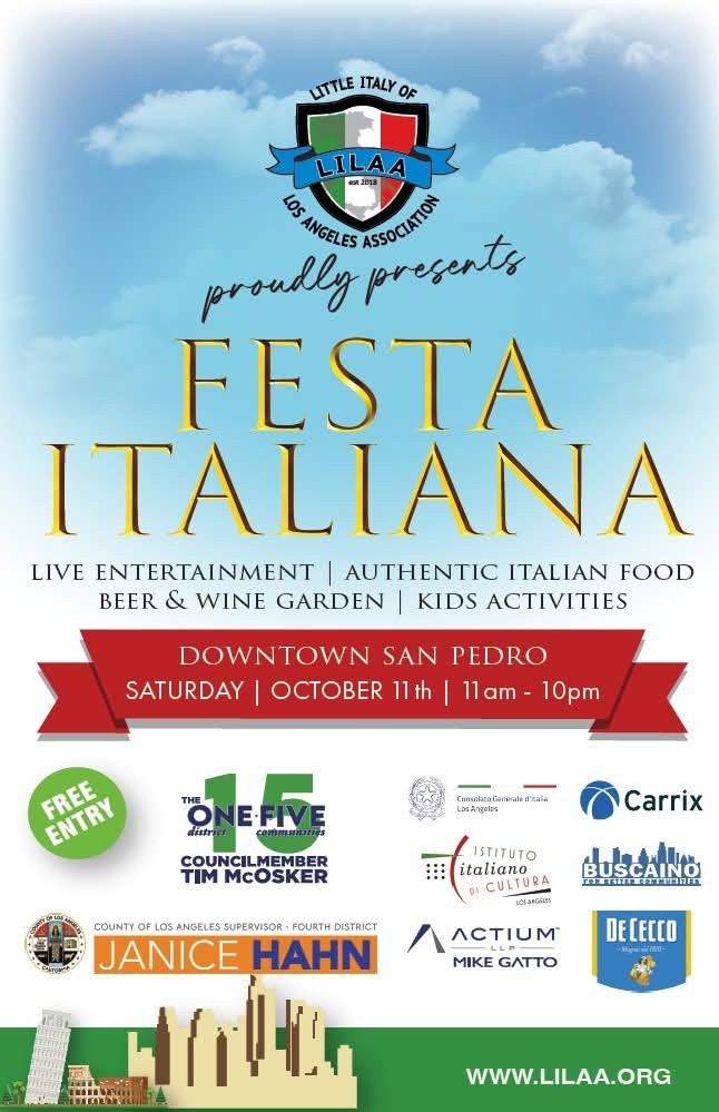 Il prossimo 11 ottobre San Pedro ospiterà una nuova edizione della Festa Italiana, la manifestazione organizzata dalla Little Italy of Los Angeles Association che celebra ogni anno la cultura e la comunità italoamericana della California del Sud. L’evento, che coincide con l’apertura del Mese del Patrimonio Italoamericano negli Stati Uniti, si svolgerà nel quartiere storico di Little Italy, area tradizionalmente abitata da famiglie di origine italiana fin dal primo Novecento, quando San Pedro divenne un punto di riferimento per i lavoratori portuali e per molti immigrati provenienti dal Sud Italia.