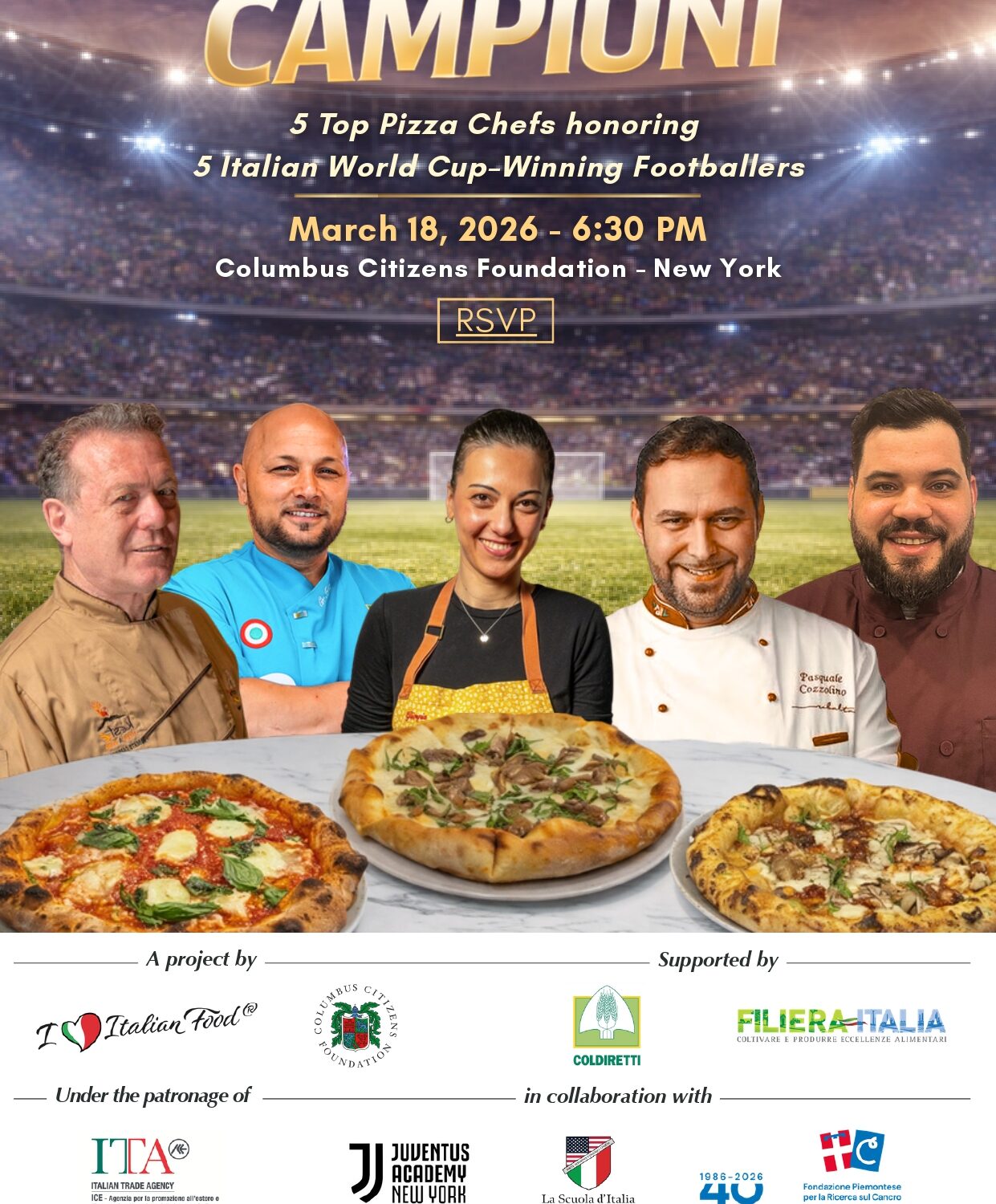 Durante Pizza da Campioni, cinque pizzaioli tra i più rinomati a New York realizzeranno altrettante pizze dedicate a cinque protagonisti delle vittorie dell’Italia ai Mondiali del 1982 in Spagna e del 2006 in Germania, due momenti che rappresentano ancora oggi i principali riferimenti della storia sportiva recente della Nazionale. Quelle due competizioni hanno contribuito a consolidare l’immaginario internazionale dell’Italia calcistica, anche grazie alle figure di Paolo Rossi, Fabio Cannavaro e Andrea Pirlo, diventate veri e propri simboli dell’italianità anche fuori dall’ambito sportivo.